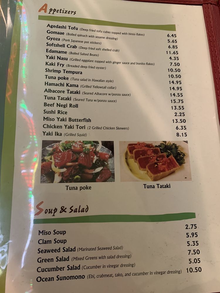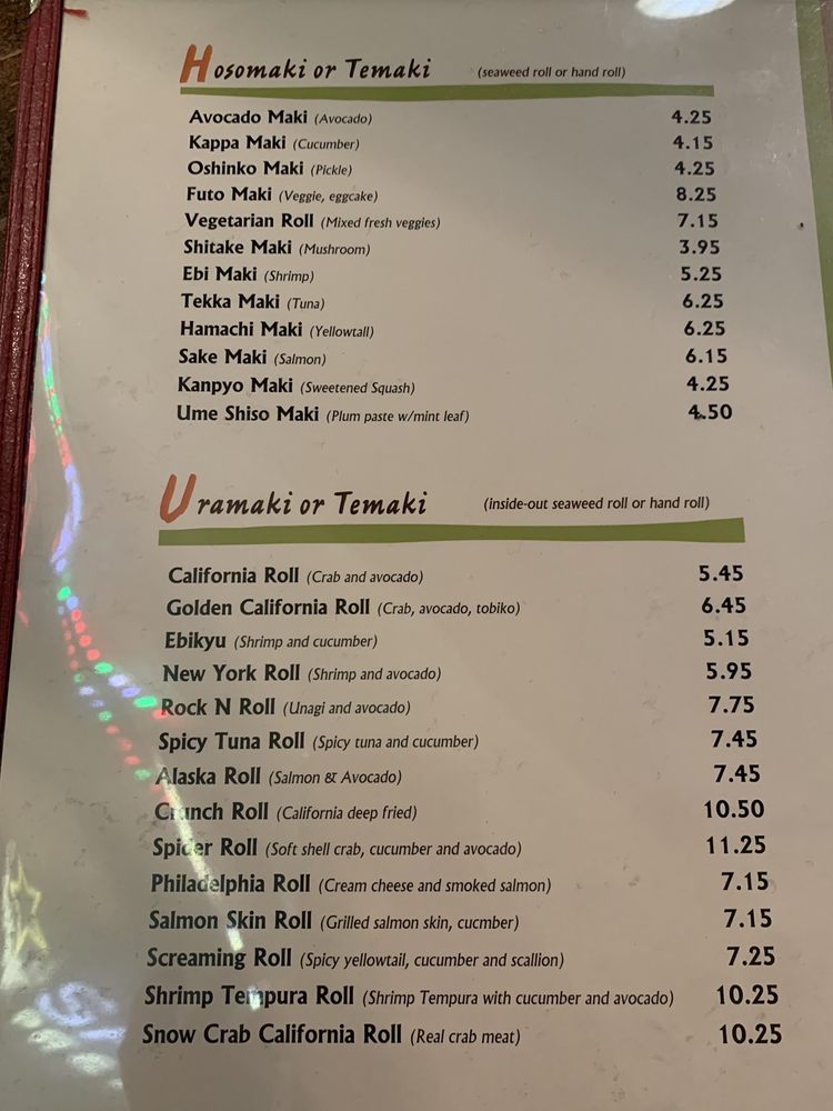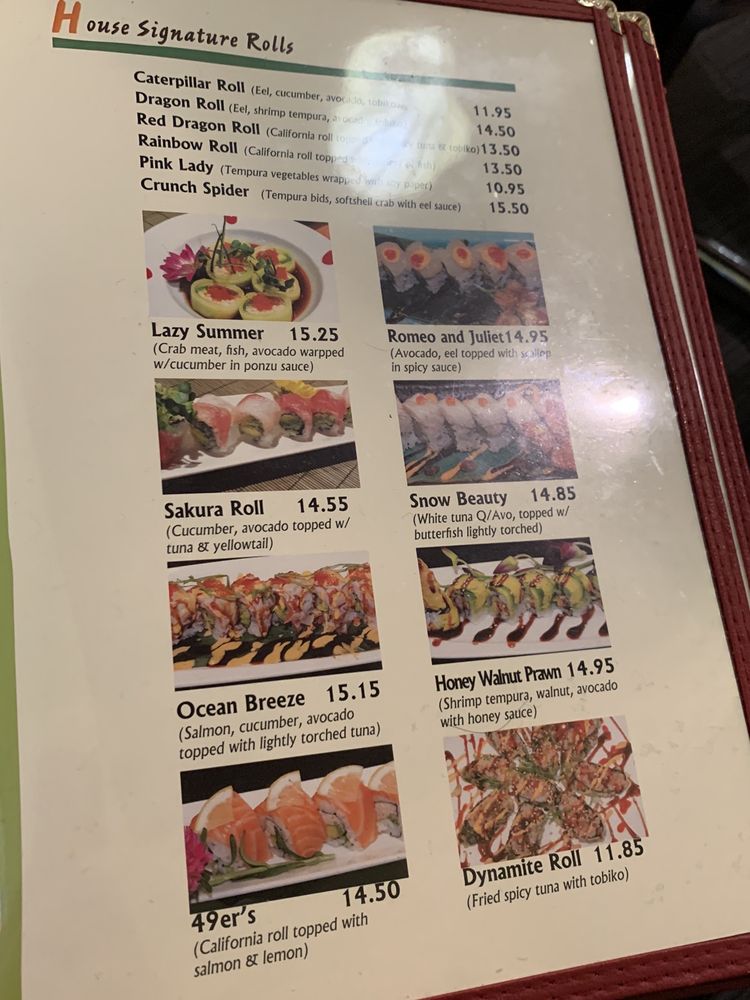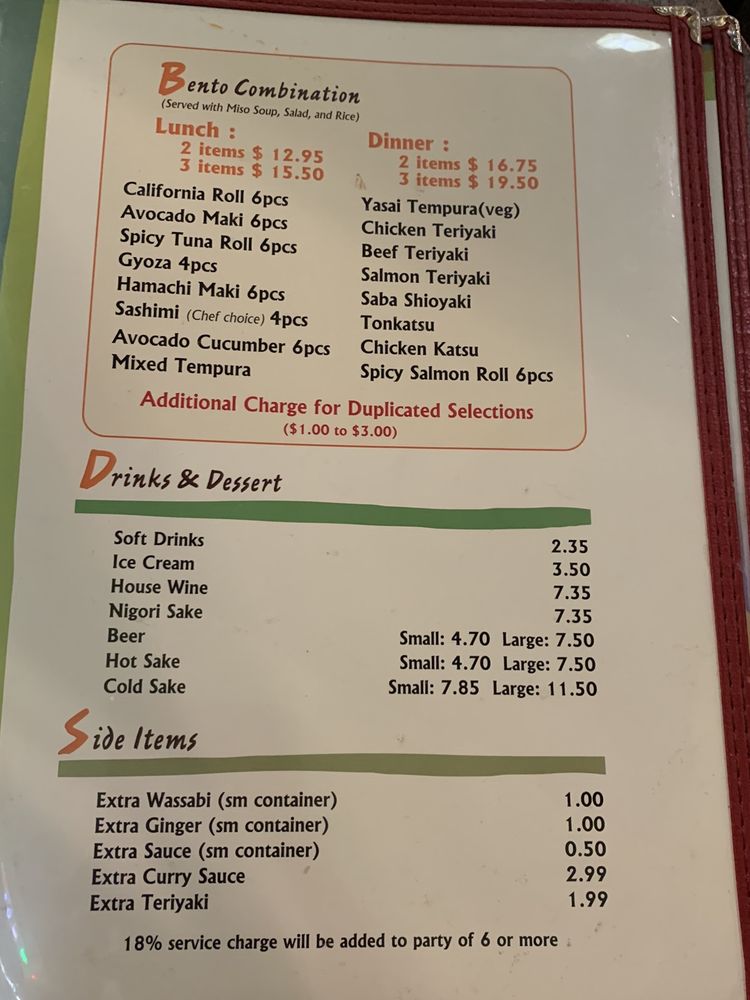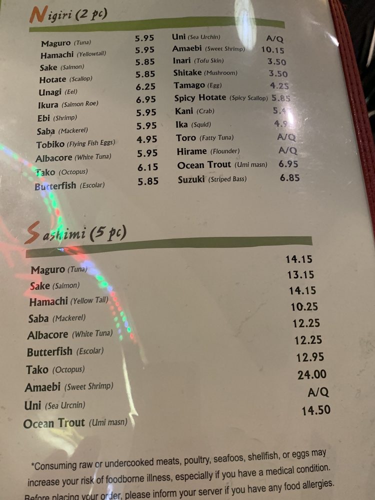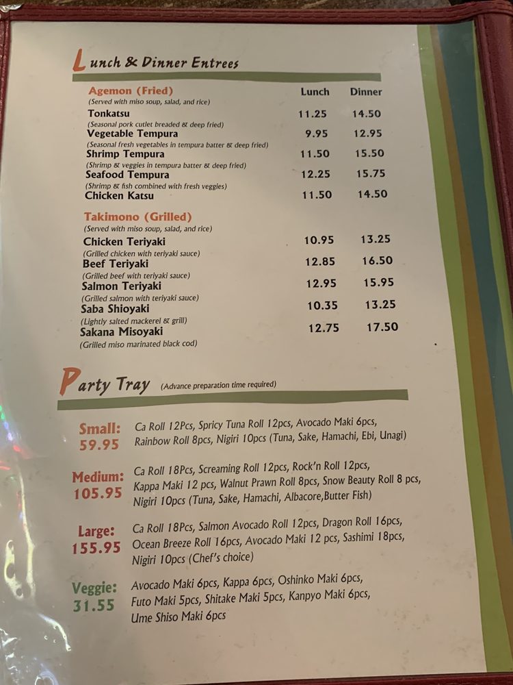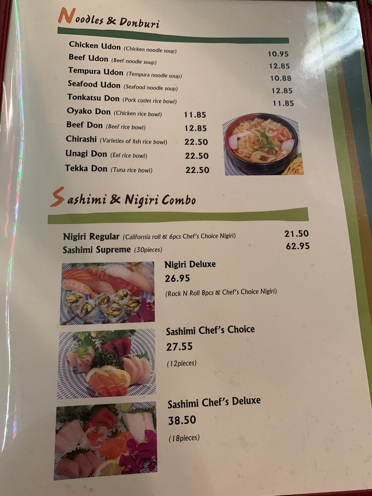 5 pieces of sushi, 6 pieces sashimi, rainbow rolll or 49ers roll.