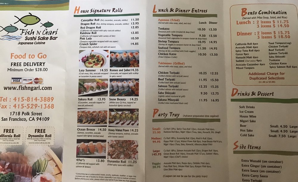 Welcome to Fish N Gari, a hidden gem on Polk Street in San Francisco, specializing in authentic Japanese cuisine. This vibrant eatery is celebrated for its casual vibe and moderate noise level, making it an ideal spot for lunch or dinner with friends and family. With a menu full of fresh, expertly prepared sushi and mouthwatering rolls, patrons rave about the delicious California Roll and the Spicy Tuna Roll, which showcase impeccable flavor and quality.